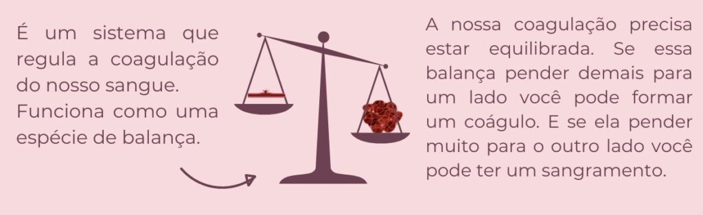 Imagine que os seus vasos sanguíneos seriam como tubos de água, ou canos, que transportam este líquido, o sangue, por todo o seu corpo. Quando você sofre um ferimento, a parede deste cano (do vaso sanguíneo) se rompe e o sangue passa a sair do vaso por esse “buraco” na parede vascular. Neste momento é necessário fazer um fechamento desse “buraco” de forma rápida, para interromper a perda de sangue. Esse fechamento ocorre de forma provisória pela formação do coágulo de sangue – que funciona como uma rolha que vai fechar este “buraco” e impedir que você continue sangrando.